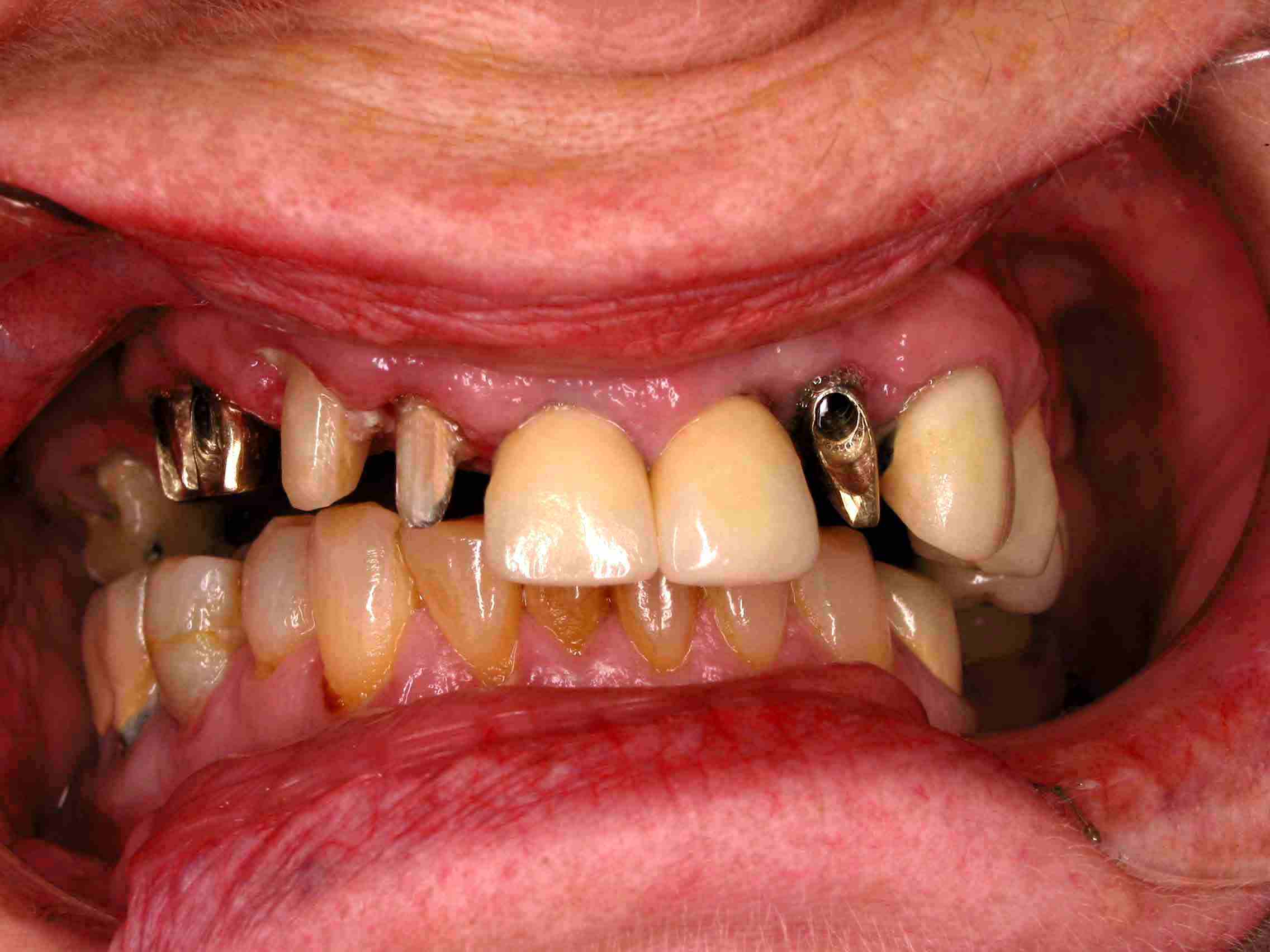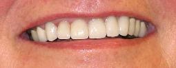 The front right central incisor tooth had to be removed due to a rare degeneration of the root. A ceramic bridge and ceramic crowns were placed on this patient's upper teeth, resulting in a natural and attractive smile.