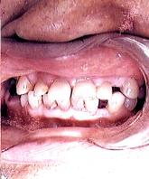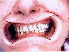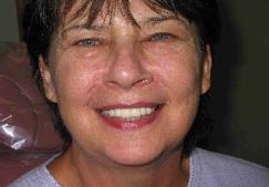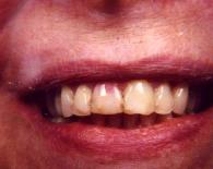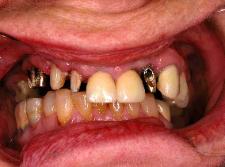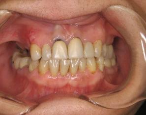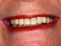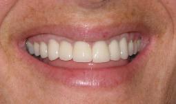 The top teeth on this patient were restored with ceramic crowns. She had extensive