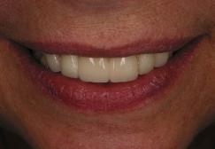 used to restore this patient's smile. The implant crowns and the crowns on the patient's own