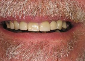 Crowns and a conventional bridge restored this patient' top teeth. To