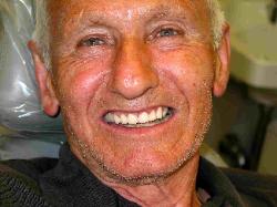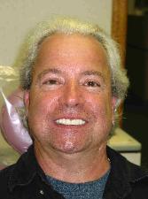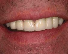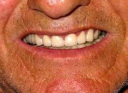 A porcelain bridge and crowns were placed on this patients front teeth. His top back teeth